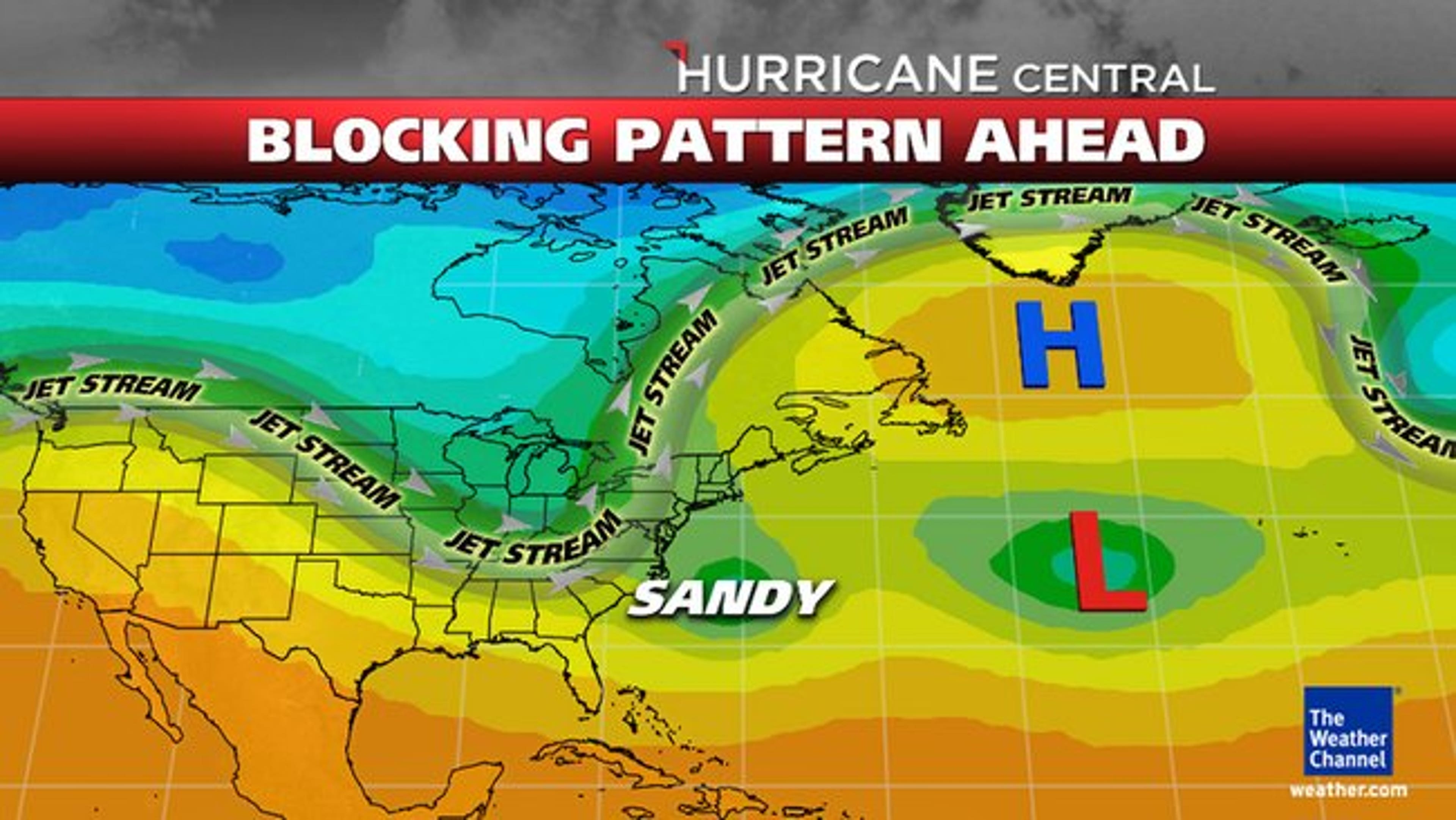 Jet stream pattern in place during Superstorm Sandy, featuring strong blocking high pressure aloft over the north Atlantic Ocean, and a pronounced southward jet stream nosedive from the Ohio Valley. This graphic was originally prepared in the days before Sandy's landfall.