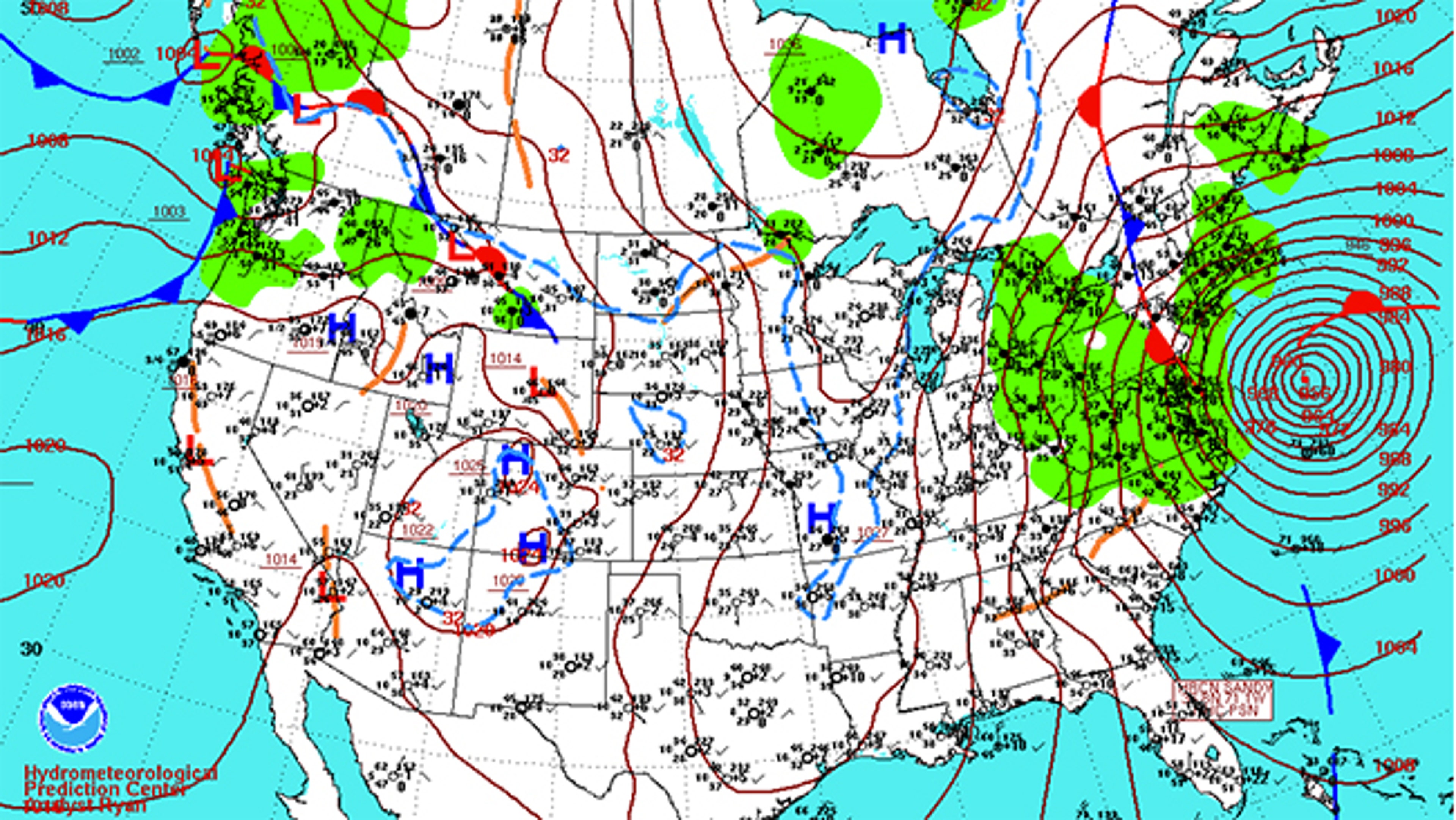 Daily surface weather map on October 29, 2012 prior to the landfall of Superstorm Sandy.