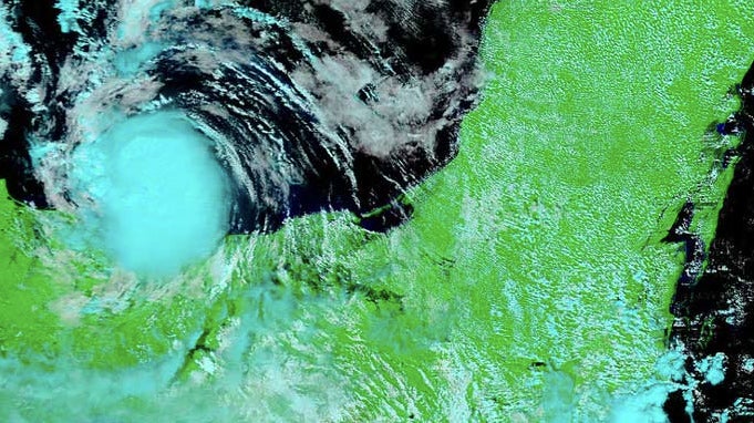 Tiny Tropical Storm Marco (left) in the southwest Gulf of Mexico in 2008. (NASA)