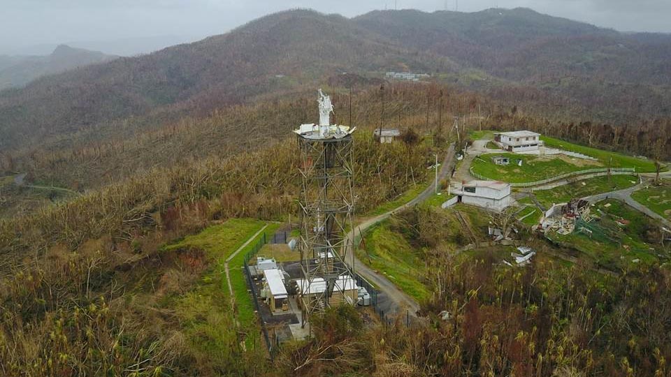 As mentioned above, the NWS Doppler Radar was destroyed by Maria's ferocious winds. This image shows an aerial view of the obliterated radar system with only the metal tower remaining.