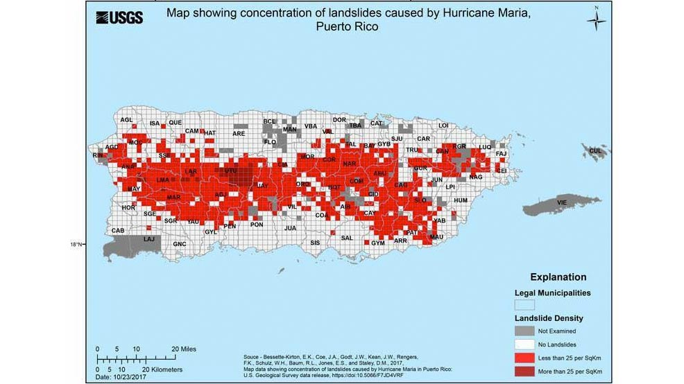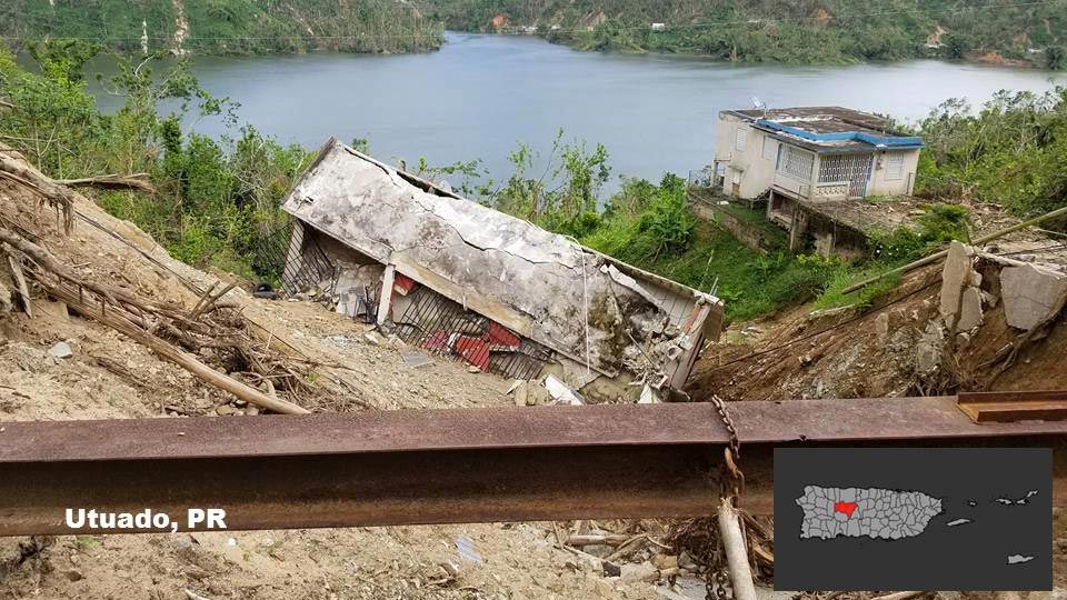 This photo shows an example of the destruction a structure suffered from a landslide near Utuado. The town is located in one of the areas where there is the highest concentration of landslides on the USGS map above.