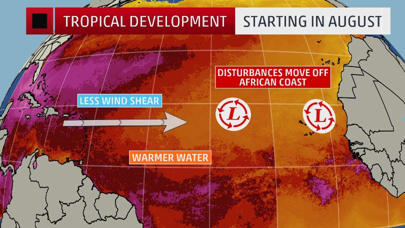 Several factors play into opening up more of the Atlantic Basin to tropical cyclone formation in the peak months of August, September and October.