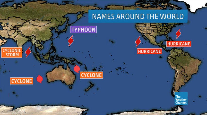 Depending on the basin, hurricanes are also named differently. For instance, in the western Pacific, hurricanes are called “typhoons” and in the Indian Ocean they are called some variant of “cyclones."