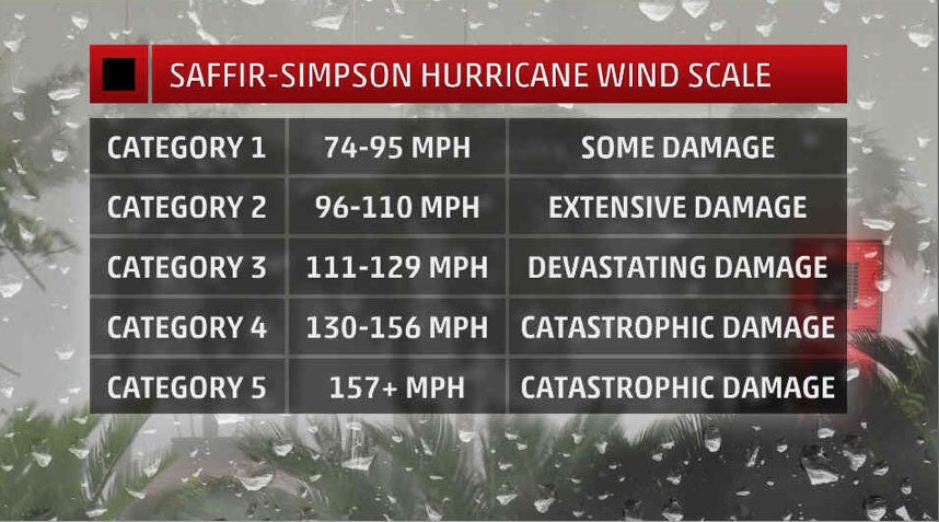 This scale is broken down into five categories of maximum sustained wind strength ranging from 74 mph to 157 mph and above. Winds can often gust considerably higher than sustained winds especially between large structures like skyscrapers and underpasses and at higher elevations.  The higher the category the more destructive the hurricane generally is. A category 1 hurricane generally can bring some damage; a category 5 hurricane can bring about catastrophic damage.