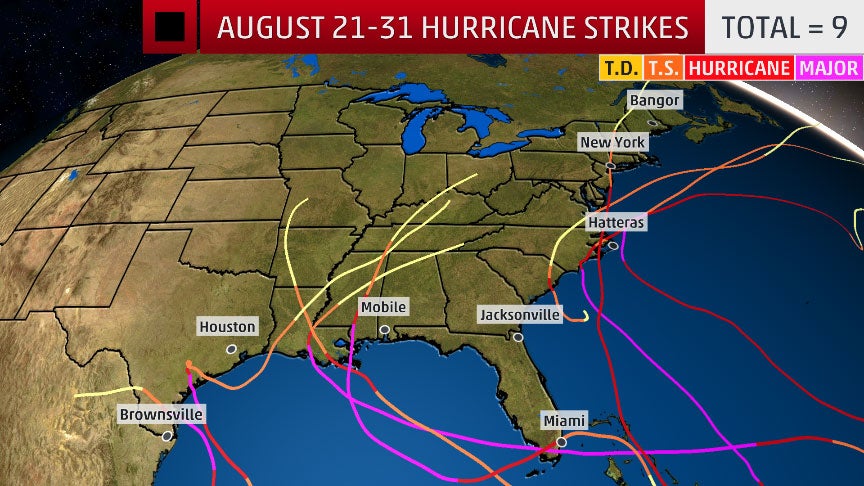 • The most active period for hurricane strikes during a given third of any month has occurred in the last third of August. Nine hurricane strikes occurred between Aug. 21-31 since 1985. This doesn't completely coincide with the peak of hurricane season, which occurs in September.