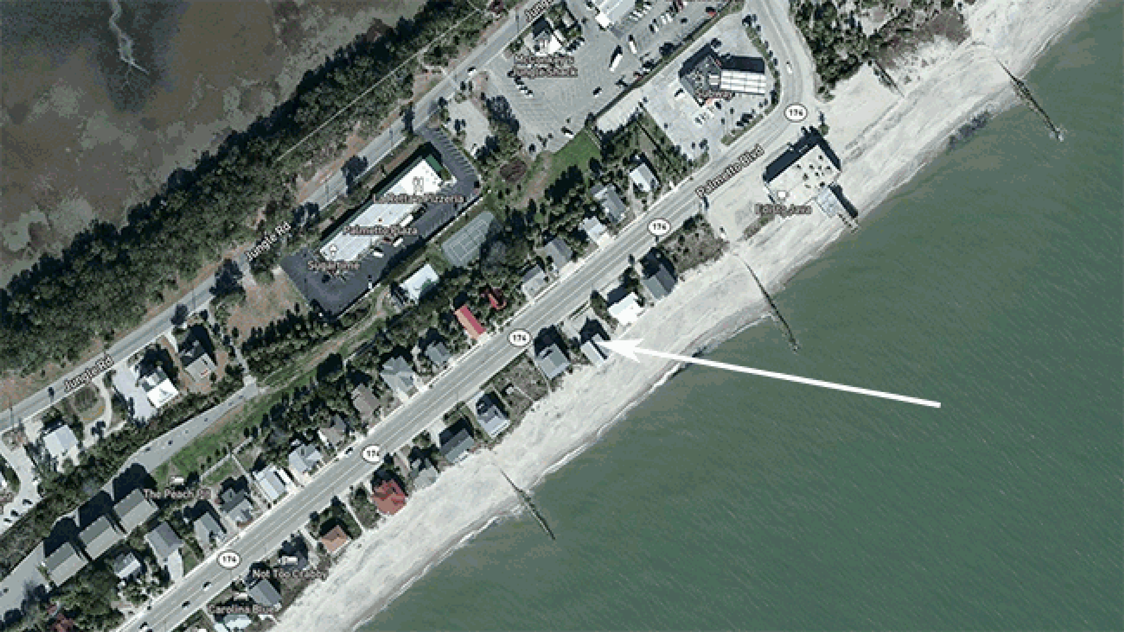 Farther north, you can see where a home was taken out in Edisto Beach, South Carolina, by Matthew. In addition, the image shows the sand that was spread inland from the coast onto the road.