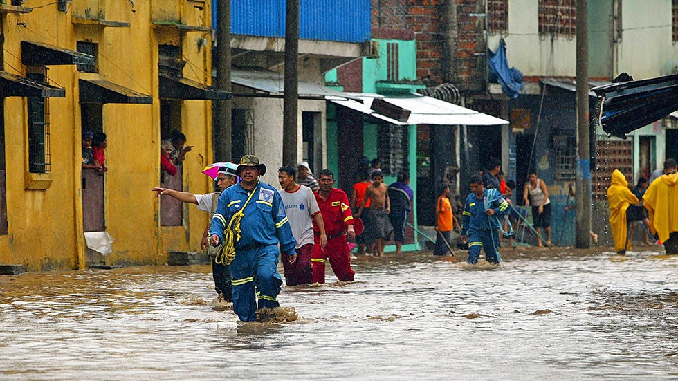 A rescue team walks in a flooded street in the El Modelo neighborhood on Oct. 4, 2005 in San Salvador, El Salvador. (YURI CORTEZ/AFP/Getty Images)