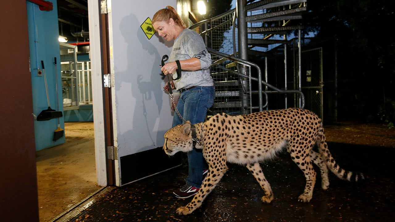 Jennifer Nelson, senior keeper at Zoo Miami, leads a cheetah named Koda to a hurricane resistant structure within the zoo, Saturday, Sept. 9, 2017 in Miami. Though most animals will reman in their secure structures, Koda and his brother Diesel and some birds will ride out the storm in temporary housing. (AP Photo/Wilfredo Lee)