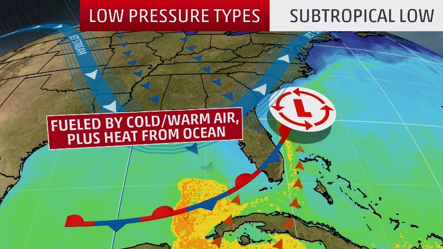 When an area of low pressure forms over waters with sea-surface temperatures of at least 70 degrees, a subtropical low can form. This is due to the core of the storm becoming warm, deriving some of its energy from latent heat, or energy released when water vapor that evaporated from the warm water is condensed into liquid.