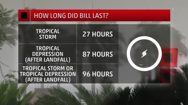 Bill lasted for 96 hours, or four days, over land as a tropical storm or tropical depression. The time spent inland is based on the first synoptic point over land through the synoptic point when the system was designated as post-tropical. In this case the time spent inland was from 1 p.m. June 16 through 1 p.m. June 20.