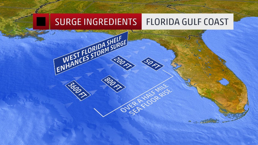 The northeast Gulf of Mexico coast from Apalachee Bay to north of St. Petersburg is prone to storm surge flooding thanks to the West Florida Shelf, where the sea floor rises significantly, allowing water driven by a tropical cyclone's winds to pile up.