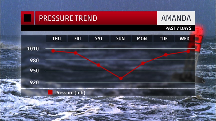 Trace of estimated central pressure of Hurricane Amanda from May 22-28, 2014. Amanda's minimum pressure was estimated at 932 millibars on May 25.