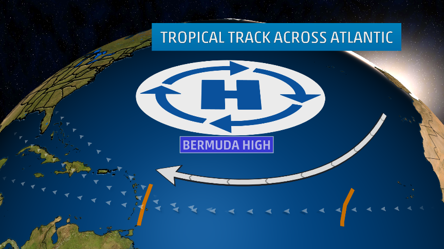 These waves journey westward across the Atlantic and Caribbean, aided by the constant push of the Bermuda-Azores High. It usually takes one to two weeks for waves to successfully cross the Atlantic, but many waves do not survive that trek.