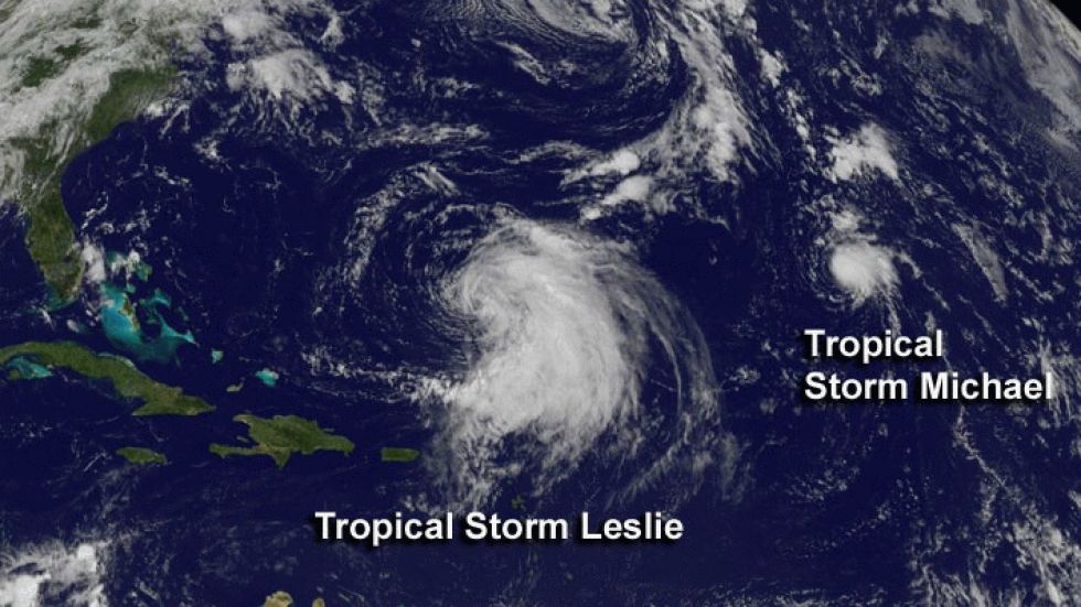 Leslie and Michael spin side-by-side in the Atlantic prior to becoming hurricanes.