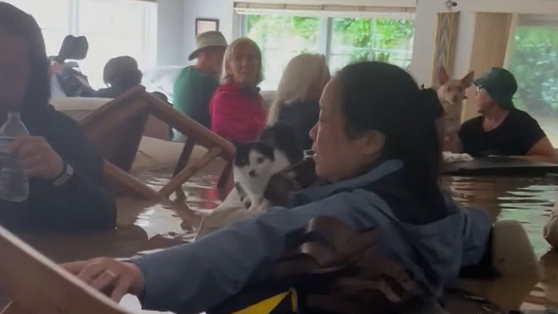 Alarming video shows a group of neighbors huddled in a home, surrounded by rising floodwaters that have already reached their chests. Watch the video to learn more.