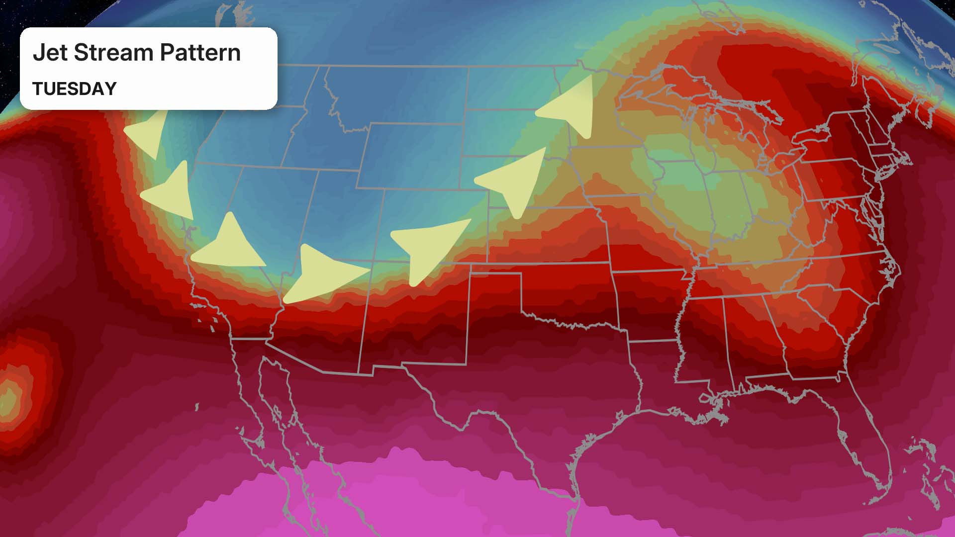 Instead of bulging north as has been common over the last few days, a southward plunge of the jet stream will carve into the West by Tuesday. In this pattern, warm and humid air eventually streams north from the Gulf into the Plains under that active jet stream. It's a setup more favorable for severe thunderstorms this time of year in the nation's heartland.