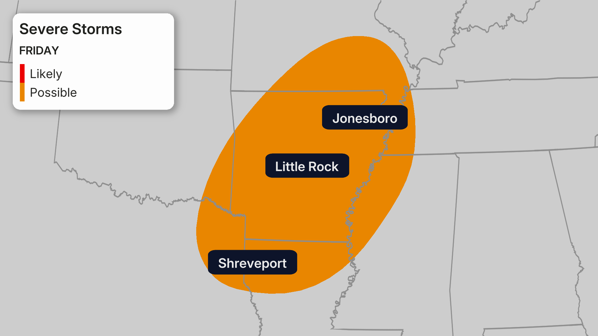 On Friday, the severe threat shifts east and south. As storms push east, they will put areas from Texas to Missouri at risk for severe storms.