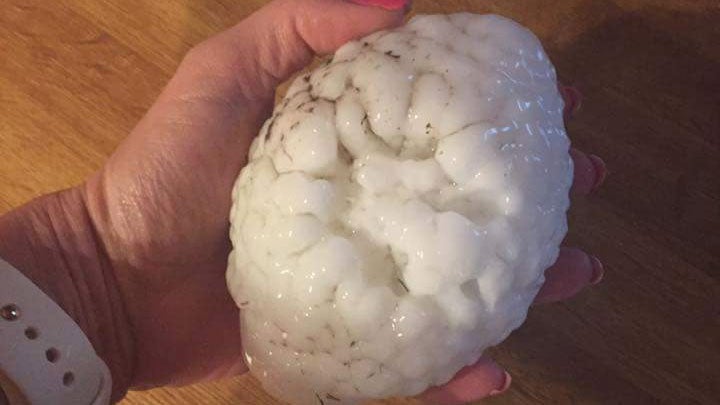 According to local reports, homes and vehicles were damaged by the hail in Lincoln on Monday. Large divots were also left behind on a golf course from the impact of the enormous hailstones.
