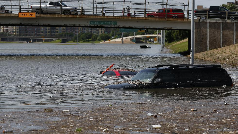 Vehicles are left stranded on Texas State Highway 288 in Houston, Texas, May 26, 2015.