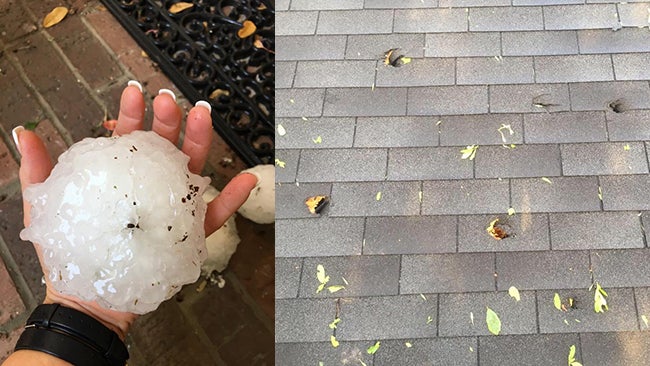 Softball-size hail (left) punched holes in a roof (right) in Wylie, Texas on April 11, 2016.