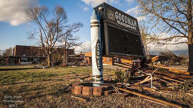 Storm damage remains on April 6, 2017, at Goodman Elementary School after Goodman, Mo. was hit by a tornado. (@mostormchaser2010/instagram)