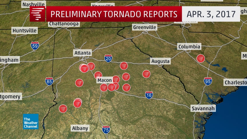 Preliminary tornado reports on April 3, 2017. Note these may not necessarily correspond to the actual number/locations of tornadoes, which are determined by NWS damage surveys.