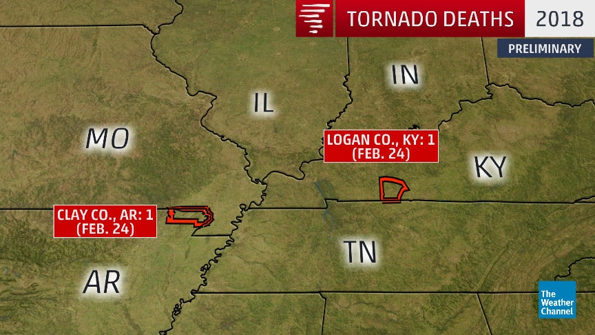 Preliminary information from the National Weather Service has determined that an EF2 tornado touched down in southern Logan County, Kentucky, killing one person near Dot. That marks the first tornado fatality in the U.S. since May 16, 2017.