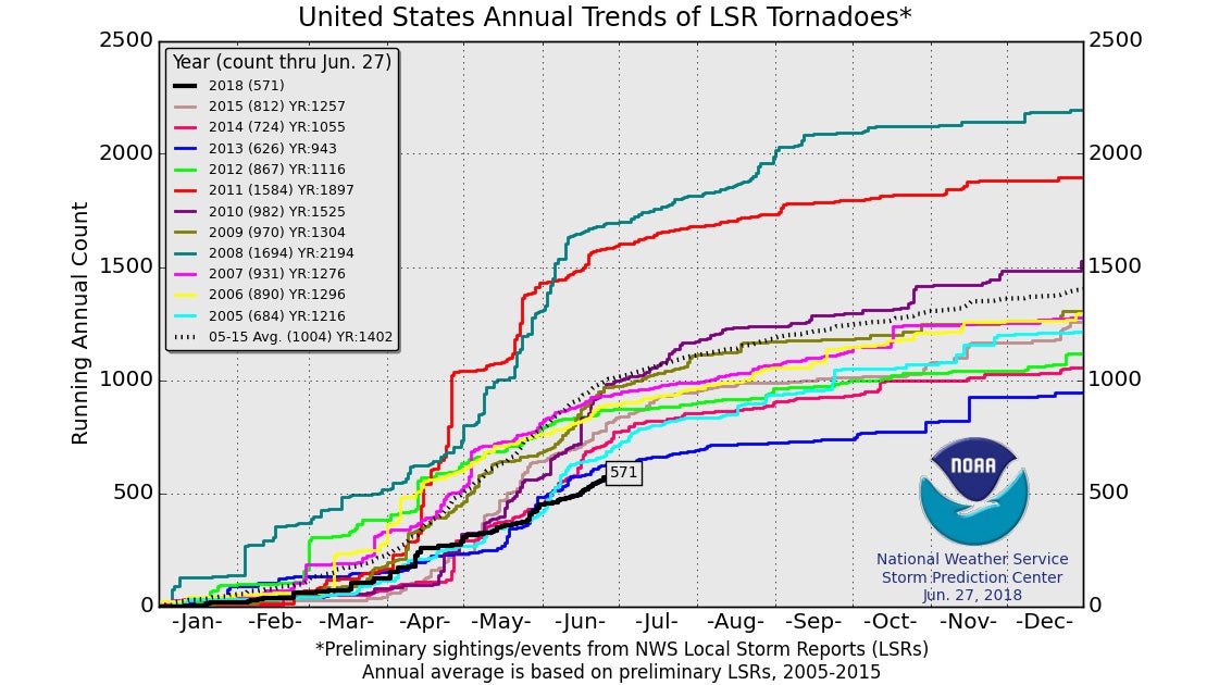 A preliminary 571 tornado reports had been tallied by the NWS and SPC through June 27; an average year would have 1,004 reported tornadoes by that date.