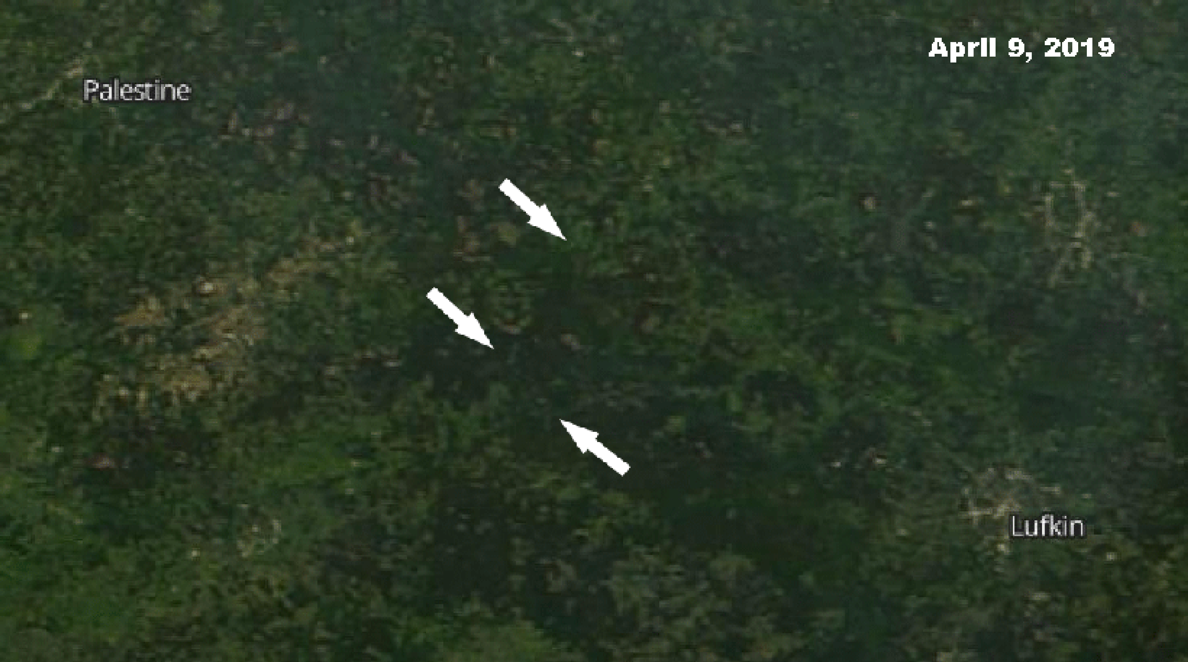 The animation below shows a comparison of NASA satellite imagery from April 9 and April 20 over a small part of eastern Texas between Lufkin and Palestine.