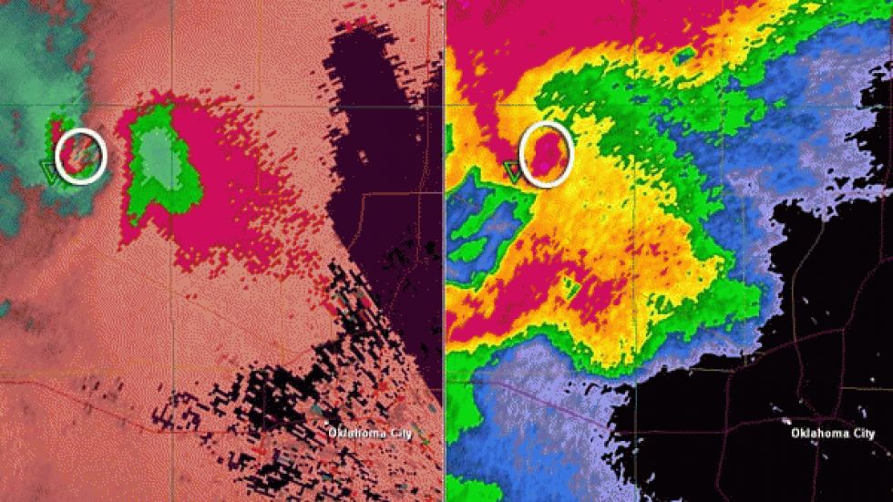 Storm-relative velocity (left) and reflectivity (right) of the Piedmont, Oklahoma, tornado at 4:52 pm CT, May 24, 2011.