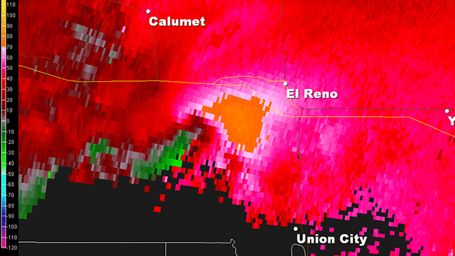 Storm-relative velocity loop from the NWS-Norman, Oklahoma Doppler radar from 6:00 to 6:19 p.m. CDT of the El Reno, Oklahoma tornado on May 31, 2013. Interstate 40 is depicted by the yellow line roughly west-to-east near the center of the images.