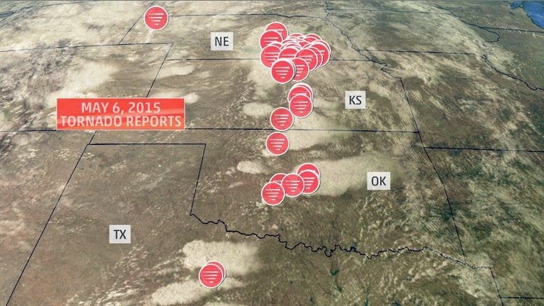 Map of preliminary tornado reports and visible satellite during the May 6, 2015, central Plains tornado outbreak.