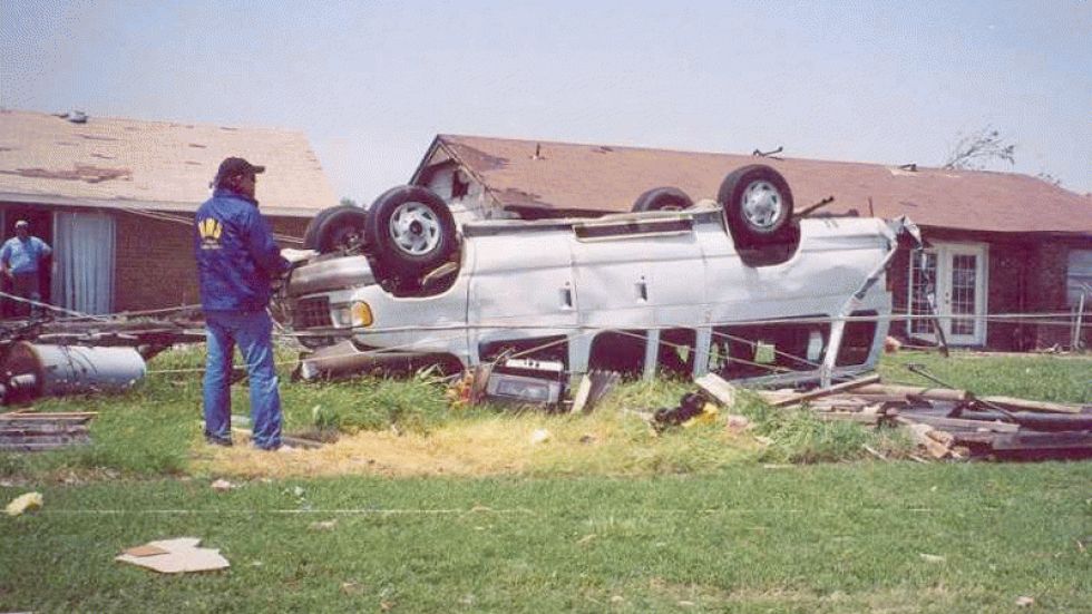 A flipped church van sits in the backyard of a home in Moore, Okla. on May 9, 2003.