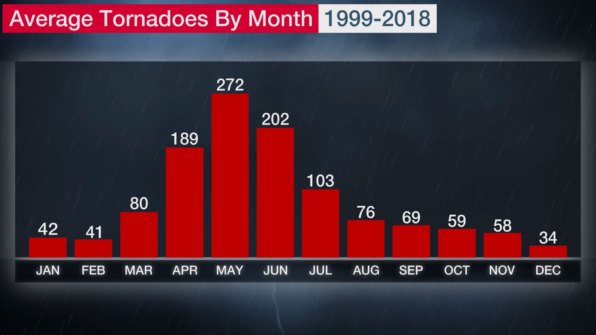 The 20-year average number of tornadoes in the U.S. per month from 1999 to 2018.