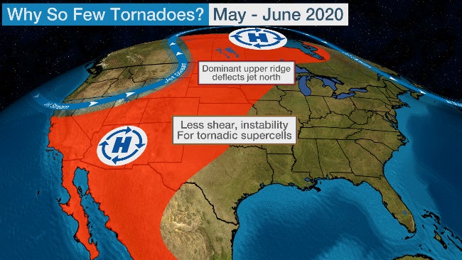 This diverted the jet stream well northward into Canada much earlier in the summer than usual, taking away wind shear needed to generate tornado-producing supercell thunderstorms in the Plains and Midwest, where they typically form in June.