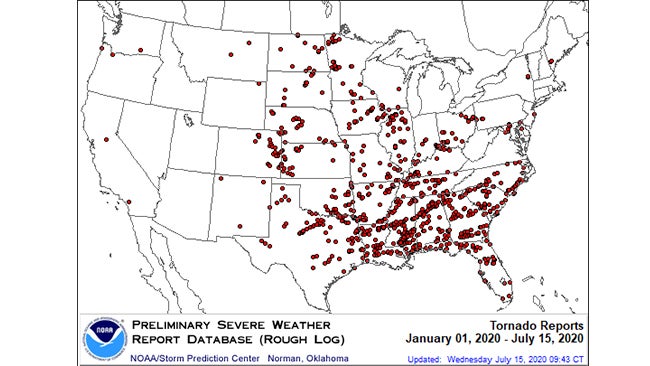 Preliminary reports of tornadoes in 2020 through July 15. Note, these preliminary reports of tornadoes may not correspond to actual tornadoes confirmed by damage surveys and may not include reports of thunderstorm wind damage later found to be from tornadoes.