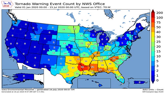 Tornado warnings issued by each National Weather Service forecast office in 2020 through July 15. NWS offices in Hastings, Nebraska (1); and Wichita, Kansas (2), have issued few warnings so far this year.