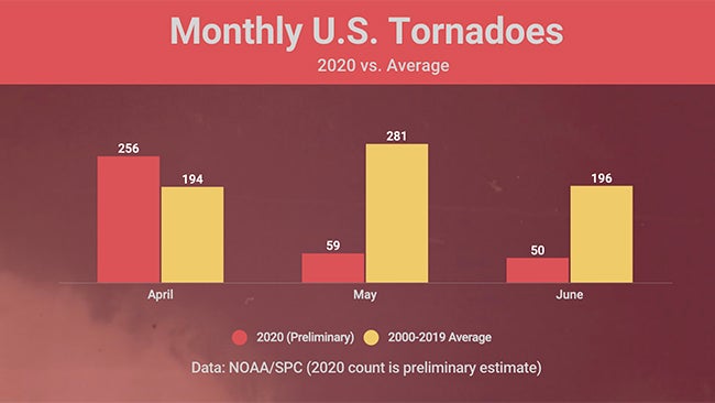 Over the last 20 years, the months of May (281) and June (196) have averaged the most tornadoes in the U.S. But in true 2020 fashion, that script has been ripped up.