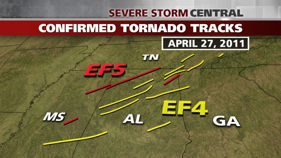 Tracks of 15 violent - EF4 or EF5 - tornadoes on April 27, 2011.
