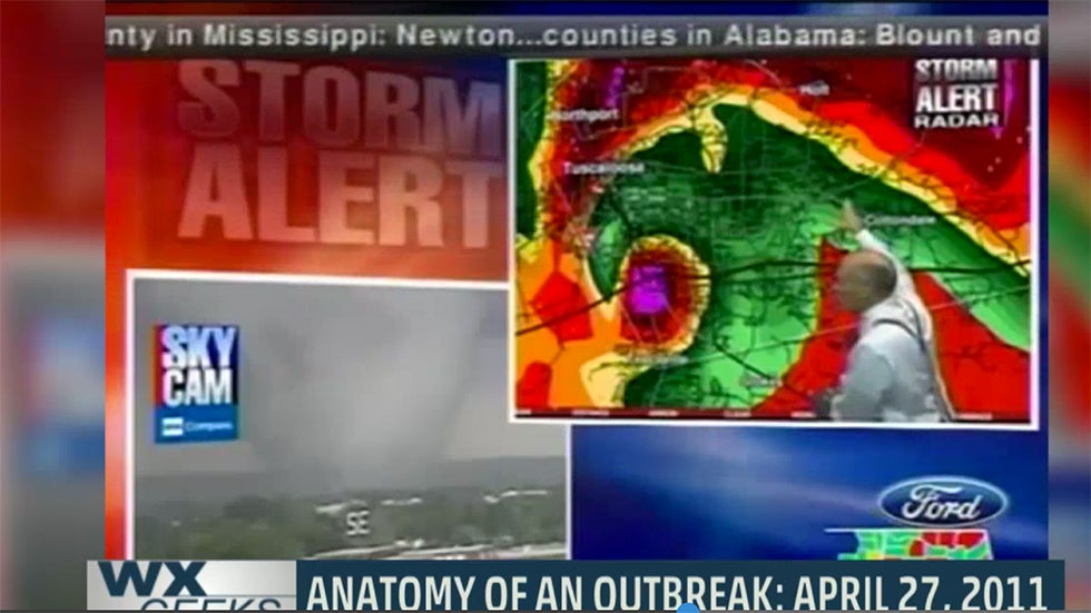 A clip from an ABC 33/40 broadcast on April 27, 2011, showed a live cam of a large tornado tearing through Tuscaloosa, Alabama (lower left), while meteorologist James Spann showed the tornado on radar (upper right). This clip was shown during an episode of Weather Geeks on The Weather Channel.