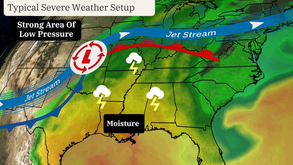 This volatile mix of ingredients can ignite severe thunderstorms and tornadoes.