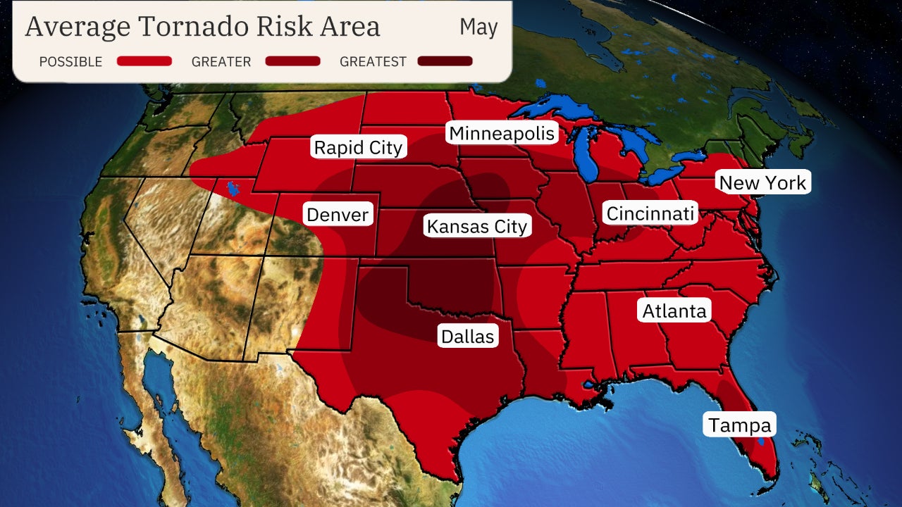 -May is when the peak of tornado activity usually occurs in the United States, with a broad area from the Plains to the East Coast having the possibility of severe storms that spawn twisters.