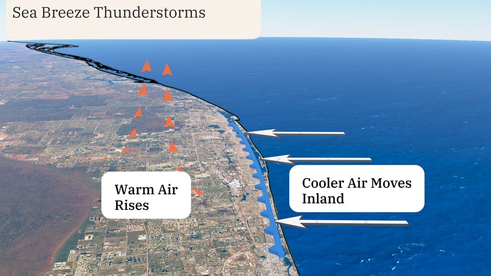 -Warmer temperatures and increasing humidity make the state ripe for increasing thunderstorms. Some of those storms develop along sea-breeze fronts as cooler air slides inland from the Gulf of Mexico and Atlantic Ocean and clashes with warm, rising air over land.
