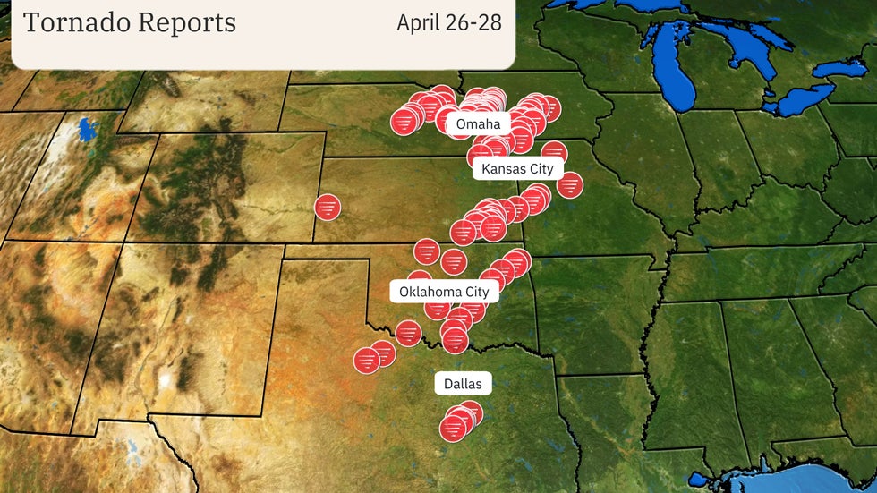 Plotted on this map are all the reports of tornadoes from April 26 to 28, 2024.