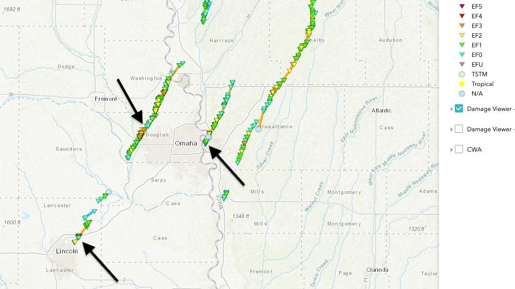 Tornado tracks on April 26, 2024, including one just northeast of Lincoln, Nebraska, one just east of downtown Omaha and another in the far western Omaha suburbs. Each of these tornadoes was rated EF3.