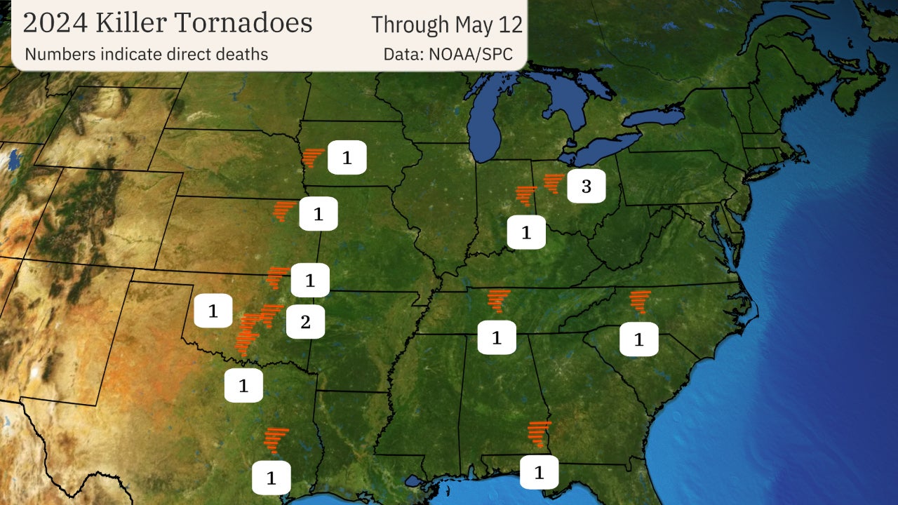 T​he tally, so far: Tornadoes have been directly responsible for 15 lives lost in the U.S. in 2024 through May 12, according to NOAA's Storm Prediction Center. As you can see in the map below, those 12 killer tornadoes have been sprinkled through the Plains, Ohio Valley and Southeast.
