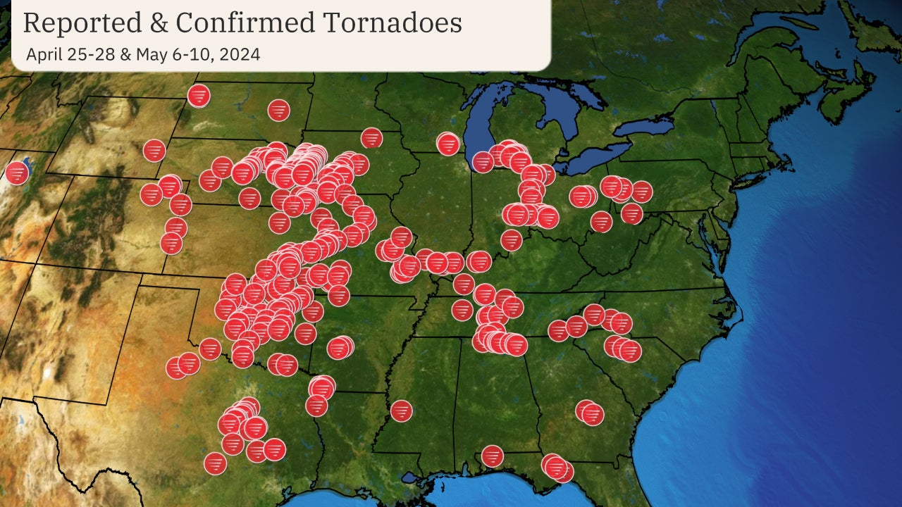 This map shows both confirmed and reported tornadoes in two separate outbreaks: April 25-28 and May 6-10, 2024.