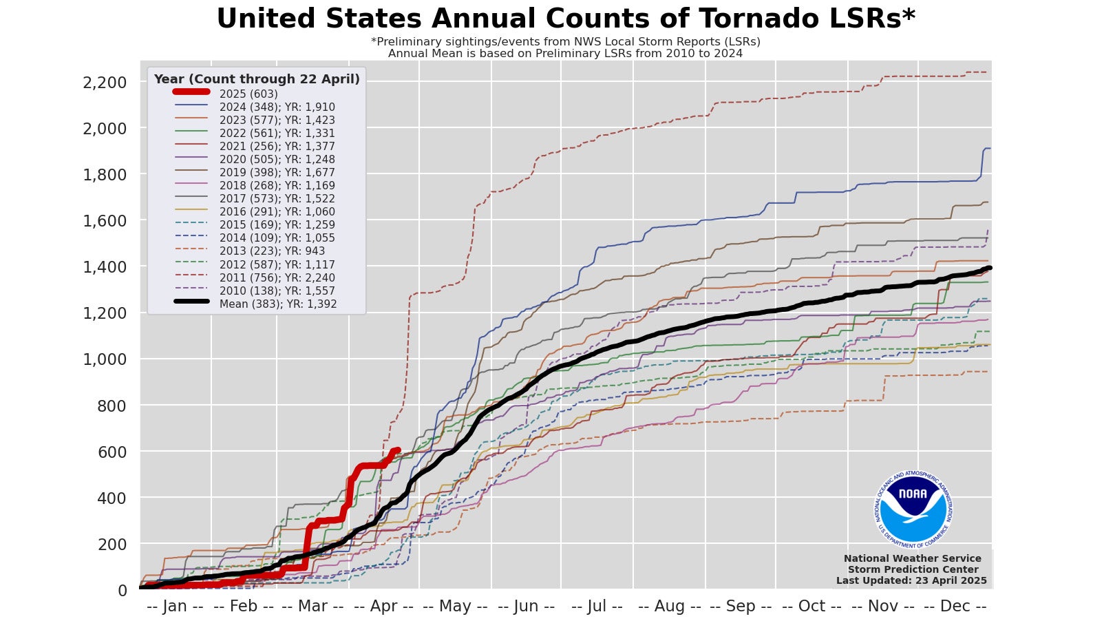 Through April 22, there have been 603 reports of tornadoes so far in 2025, according to NOAA's Storm Prediction Center.