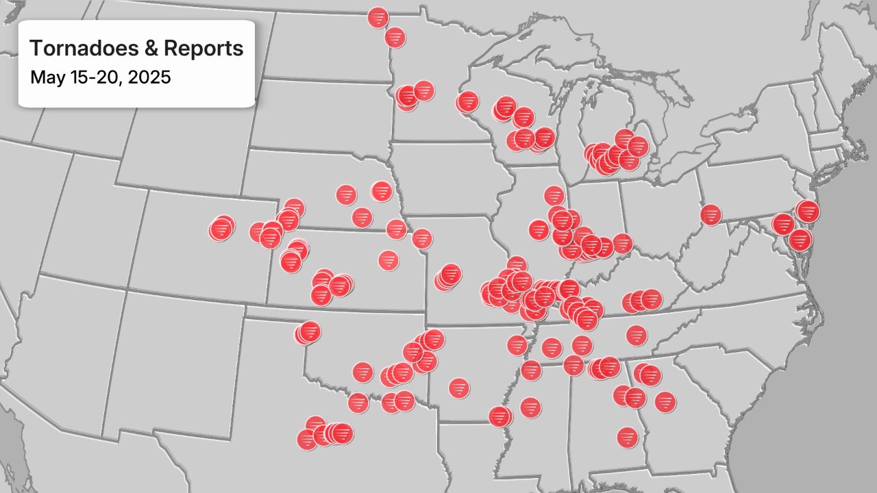 This map shows confirmed tornadoes and preliminary reports from the May 15-20, 2025, outbreak.