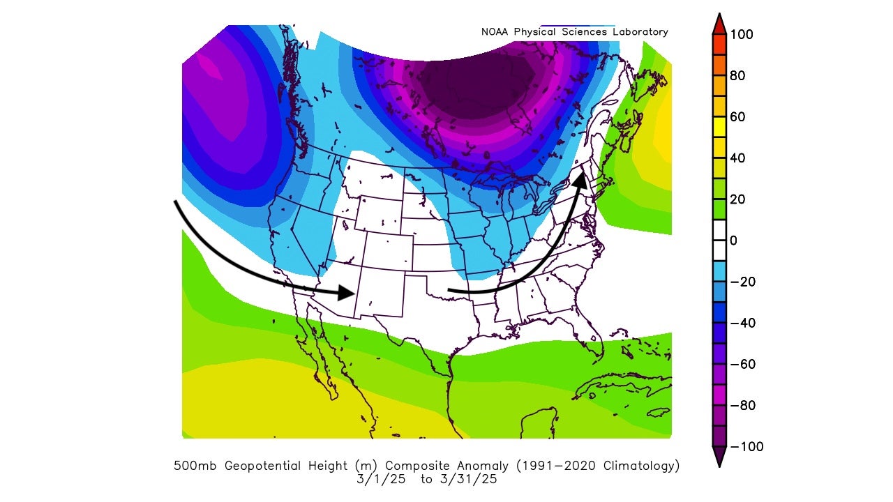 The dominant upper-air pattern in March 2025 featured prominent southward plunges of the jet stream in the West and central U.S.